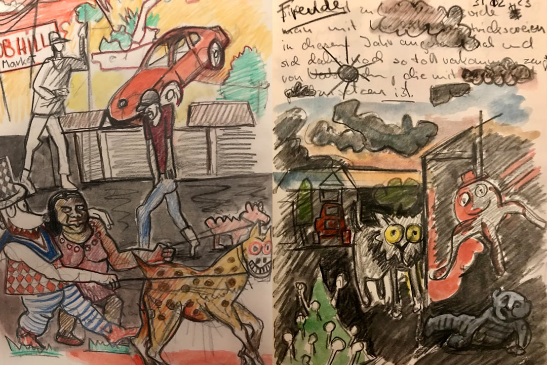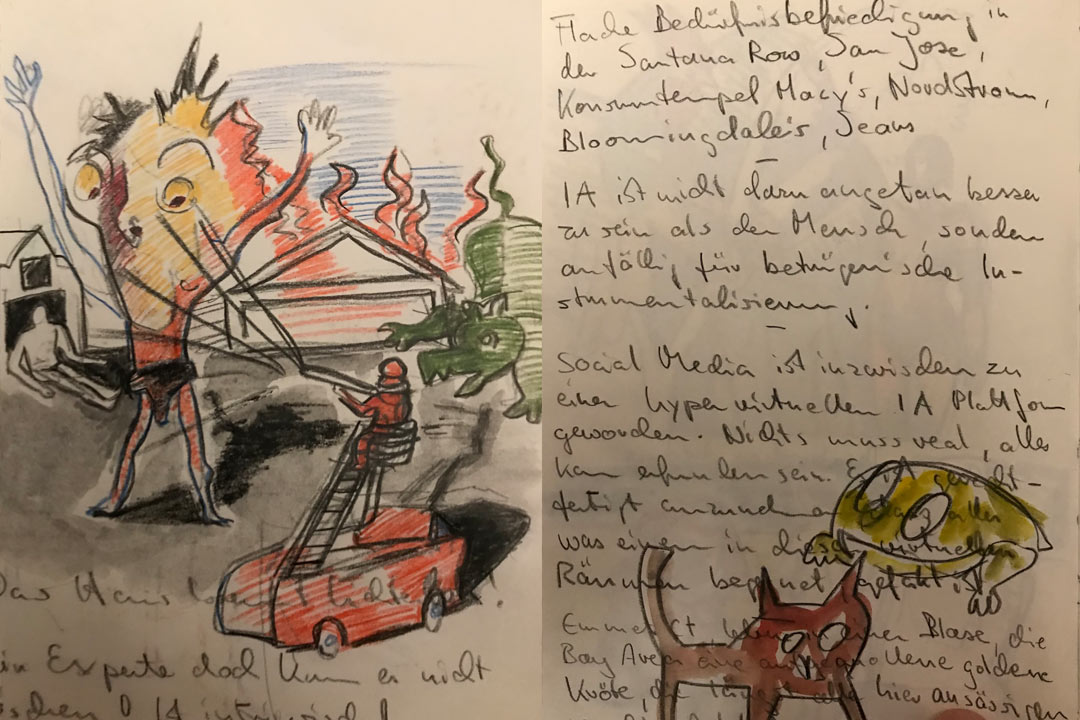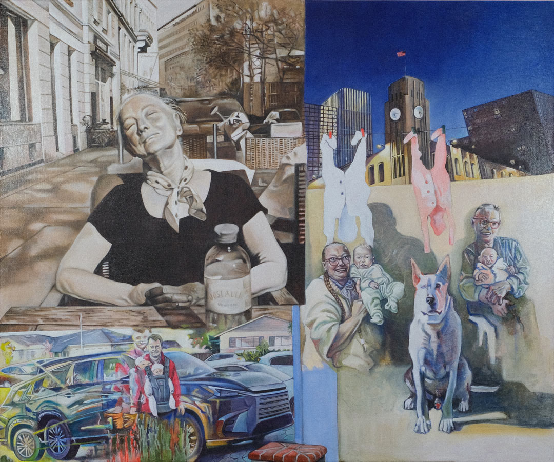 The image „The Dog that Barks“ is connected to the image „Emmett Ct.“ It has autobiographical content and focuses on the daily life of a young family in Silicon Valley. Various elements come together here. I work in a photorealistic style and then alienate the images I create, transforming them into caricature or the surreal, while also incorporating a psychoanalytical-systemic perspective into the narrative.